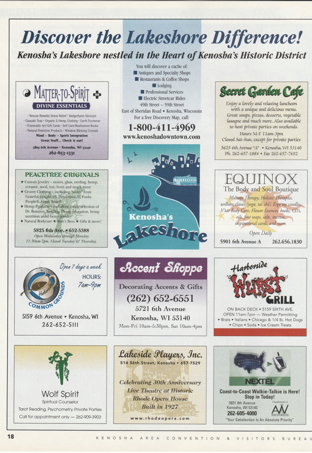 During our most recent lockdown (this time because of 16 inches of snow) I was doing some Spring Cleaning and came across an issue of the 2004 Kenosha Area Visitors Guide. While thumbing through it, past an ad promoting Dairyland Greyhound Park among other bygone businesses I found a full page ad for “Kenosha’s Lakeshore” aka Downtown Kenosha.