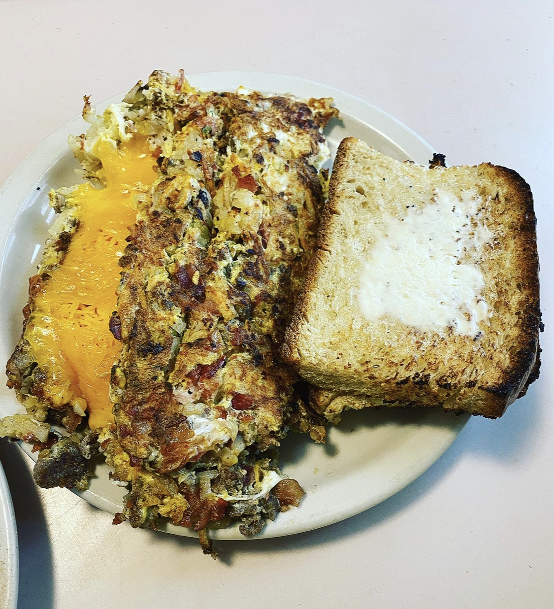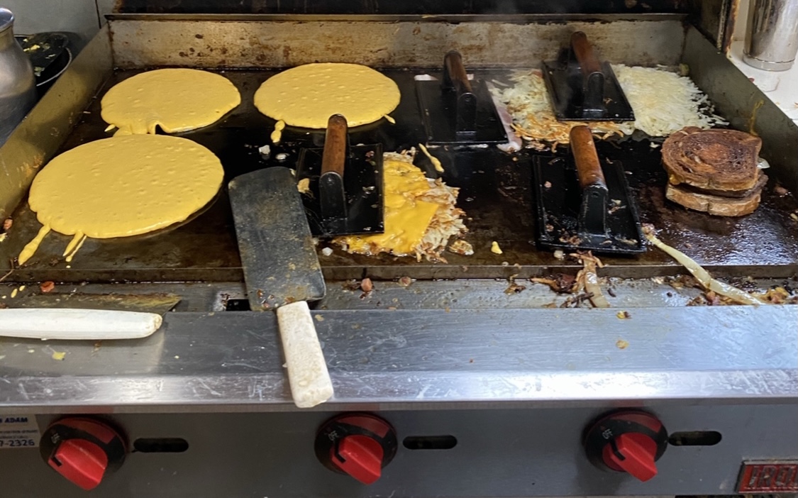 A. The garbage plates, which are a base of hash browns, green peppers & onions, you choose 2 or 5 eggs, choose your meats from sausage, bacon, spam, corn beef hash, ham, or chorizo, add cheese –  American, Swiss, cheddar, mozzarella, hot pepper jack or feta. We mix it all together and add jalapeños if you like. We also serve it with our homemade bread, which is world famous.