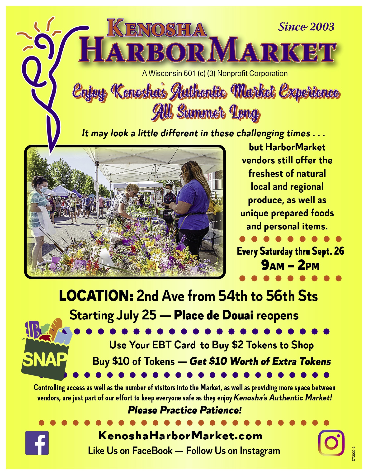 We have been working closely with officials of the City of Kenosha and Kenosha County to assure the safety of Market visitors, as well as our valued vendors. New guidelines and requirements regarding points of access, crowd-spacing and sanitation are in place. We are happy to see the public is helping us protect both them and the vendors by paying attention to new signage and by using requested access points and paying attention to crowd-flow directions.