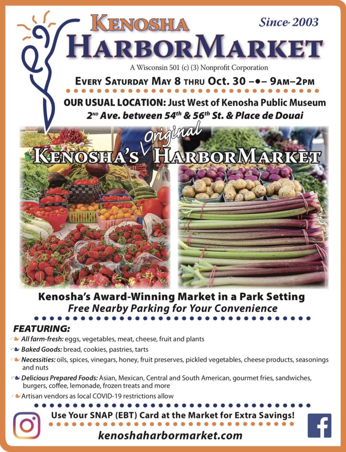 For current updates, such as vendor lineups, changes required by local officials, seasonal produce arrivals and other useful information, visit Kenosha HarborMarket on Facebook, or the HarborMarket website: kenoshaharbormarket.com
