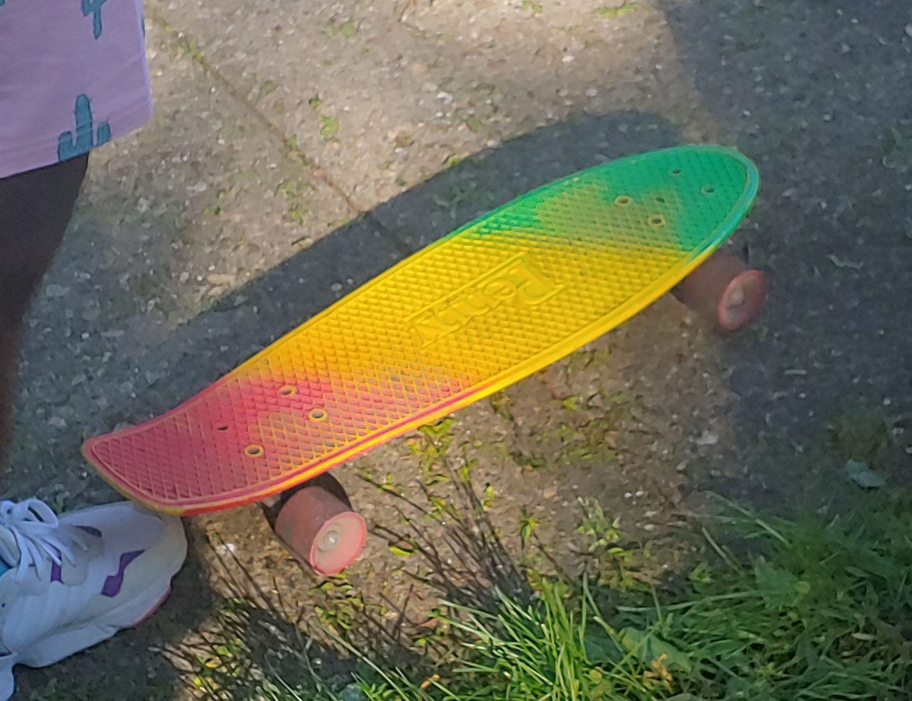 A: It’s a Nickel, by Penny skateboards. It’s a 27” board with these nice jelly wheels, it’s a real smooth ride. I own multiple boards, I have many aggressive skateboards for the skate parks, but this one is nice for the roads.
