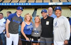 Photo: Gavin Lux is centered by proud parents Heather and Tom in Los Angeles, California. Photos by Jon Soohoo, courtesy of the Los Angeles Dodgers.